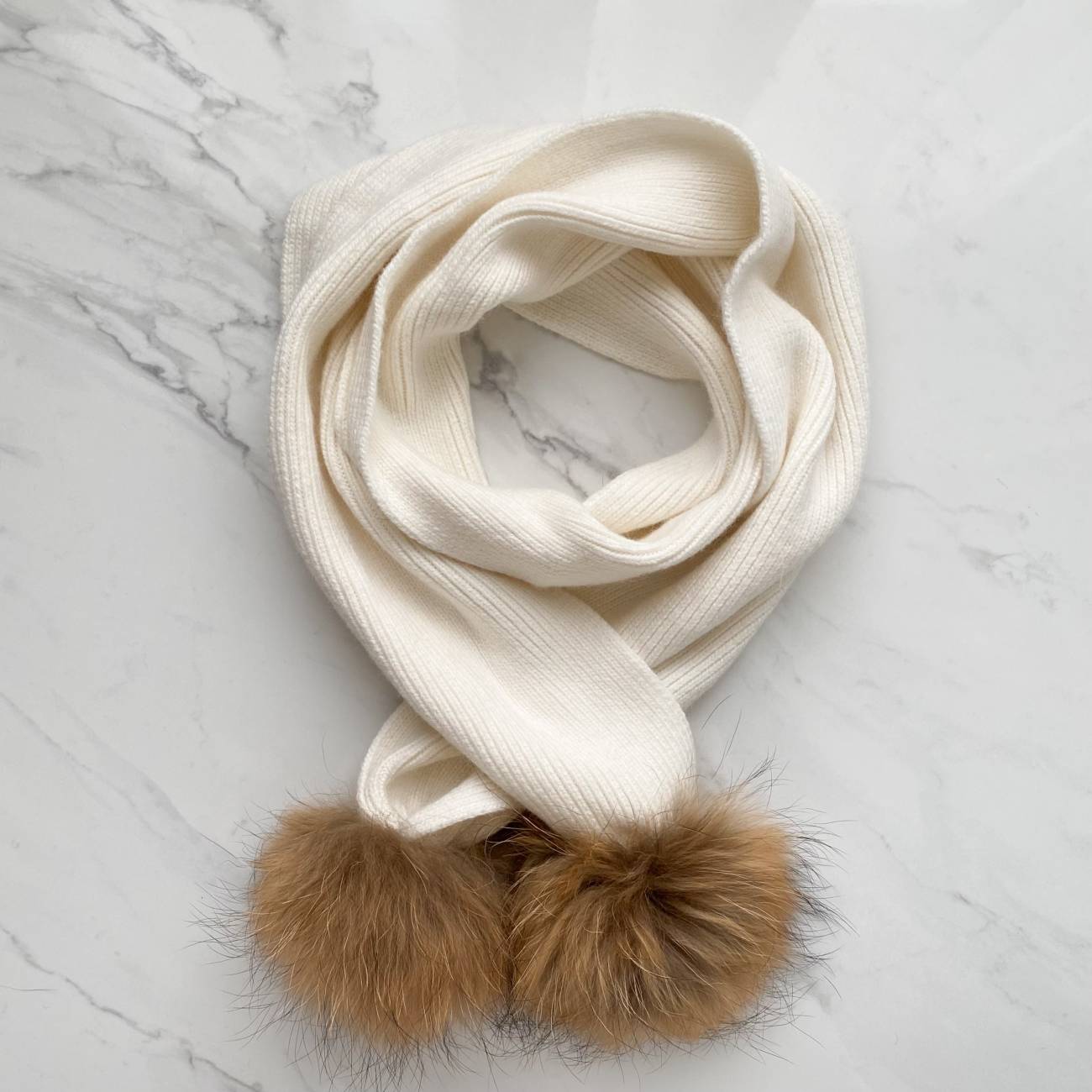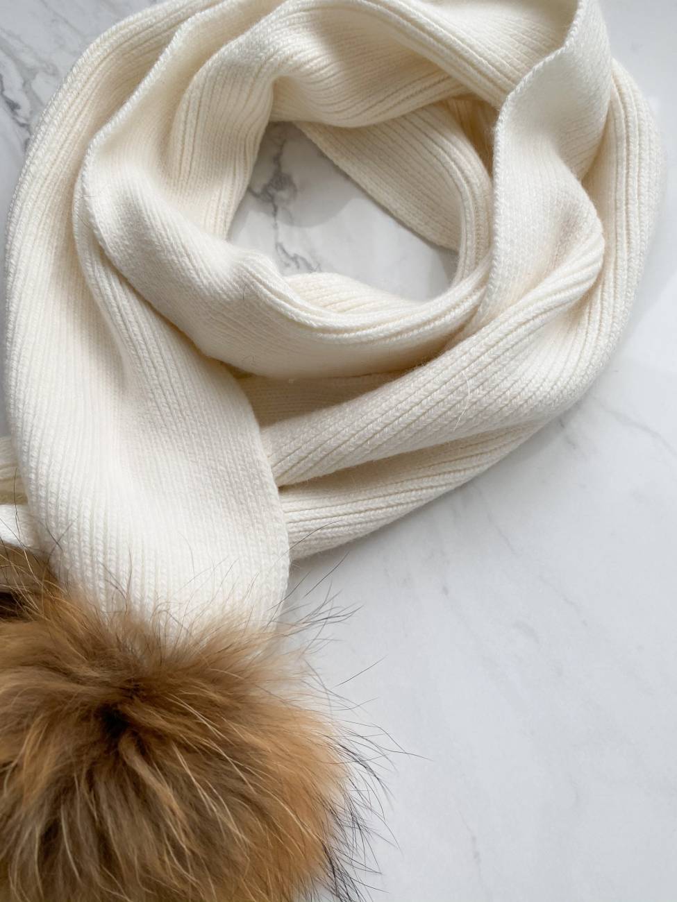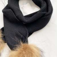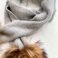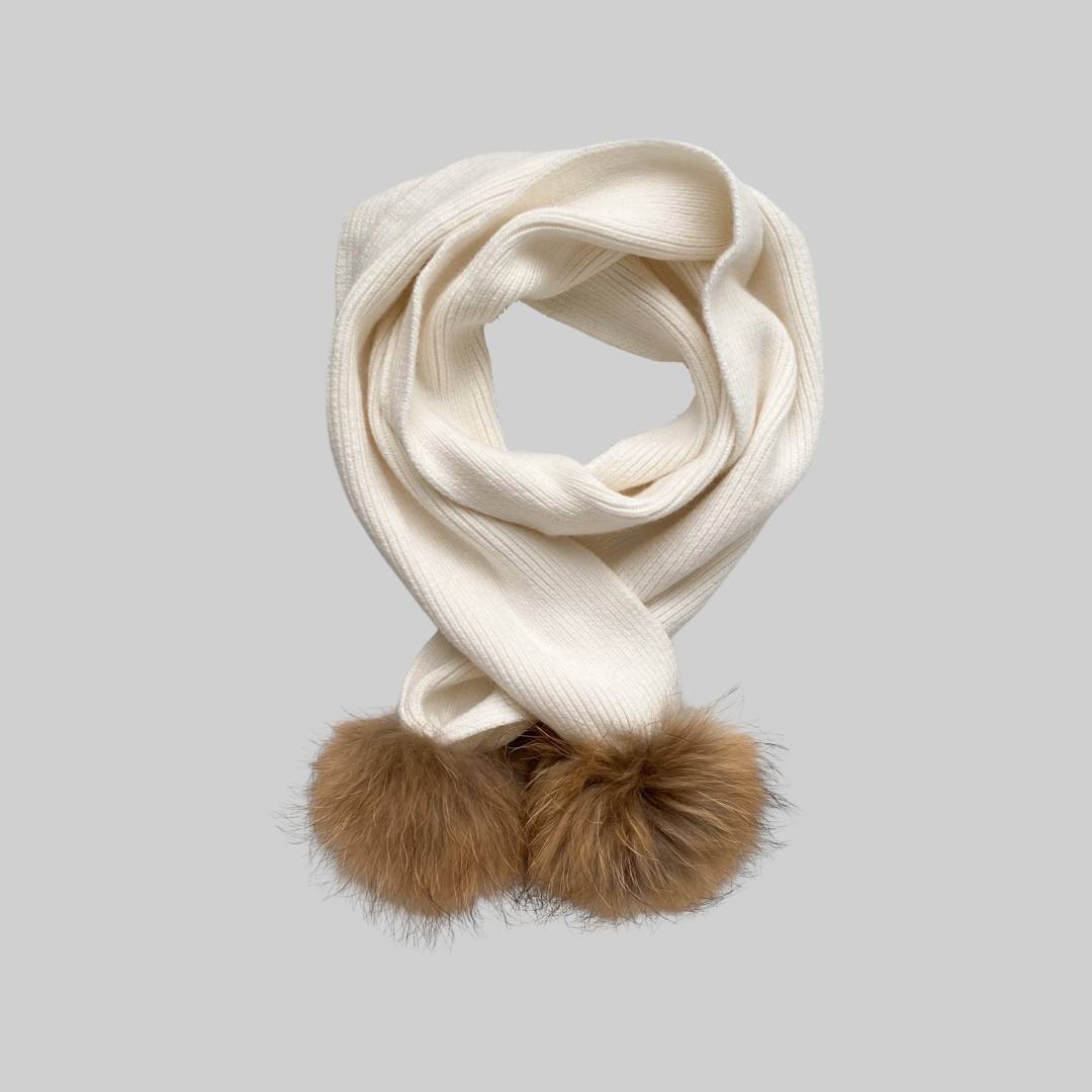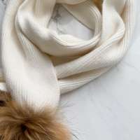 Fular din lâniță angora, potrivit pentru căciulițele angora sau cele din cașmir, cu două pompoane din blană de raton 100%.